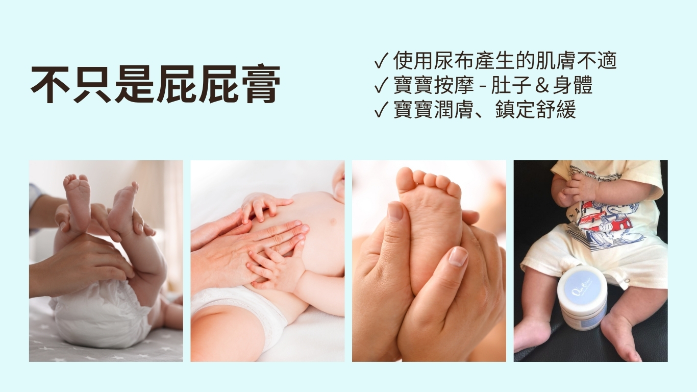 全配方不含水、不含防腐劑、不含人工香精、不含乳化劑、不含石化成分與矽靈,寶寶使用更安心,媽媽爸爸都能放心。也非常適合全家人一起使用,是居家必備的萬用舒緩護膚好物。