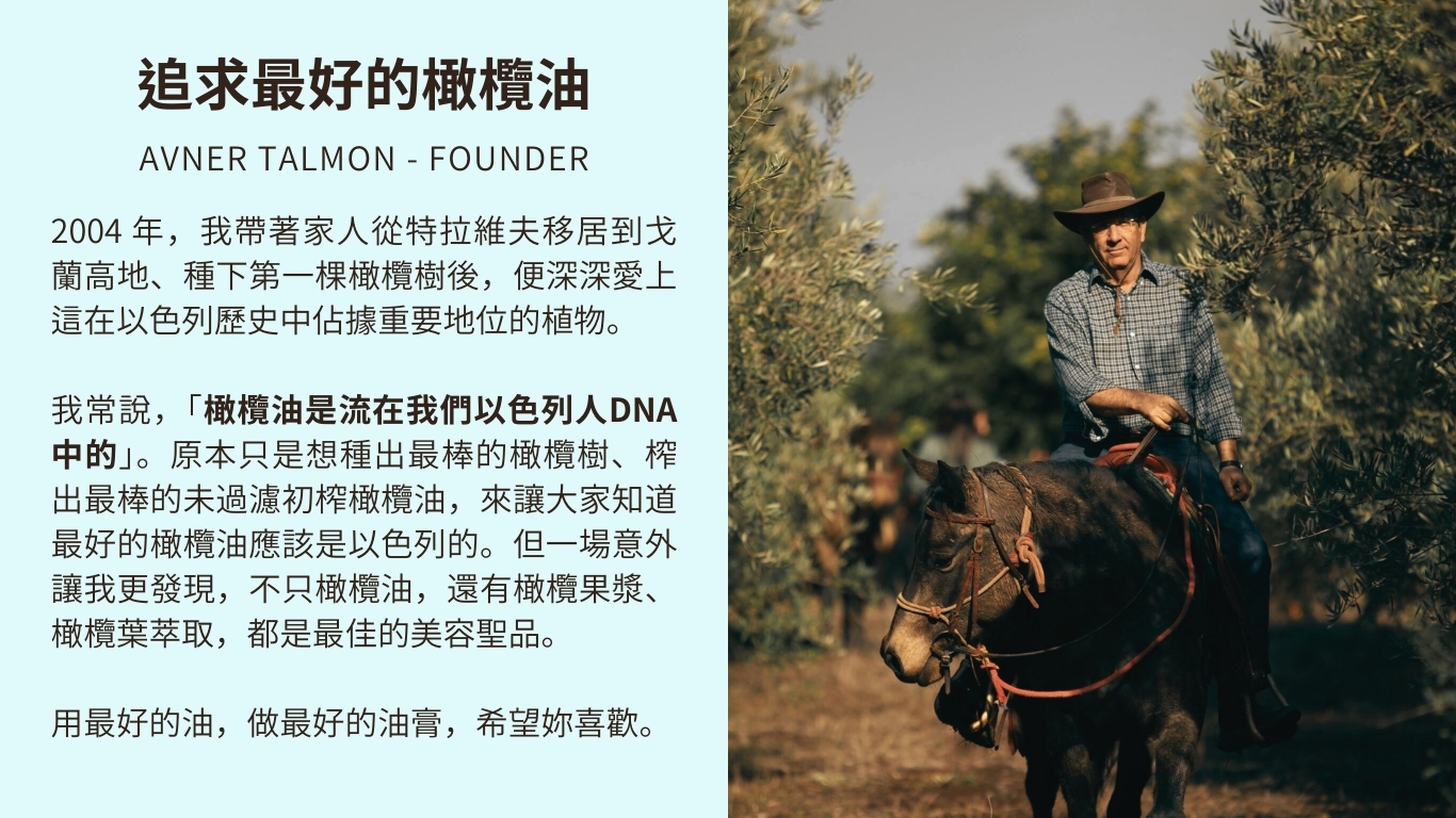 因為我們是以色列人,關於橄欖油的諸多知識與訣竅,我們有來自數千年傳統的積累,可以說橄欖油存在我們的DNA中 ..... 因此在20多年前,塔蒙德夫婦帶著家人,來到以色列北部加利利海旁的戈蘭高地,開始了他的橄欖園夢想。
