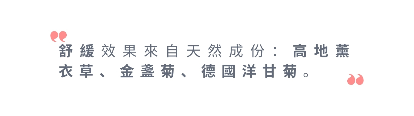 ➤ 添加高地薰衣草精油、金盞菊與洋甘菊萃取,帶來舒緩與安撫感受