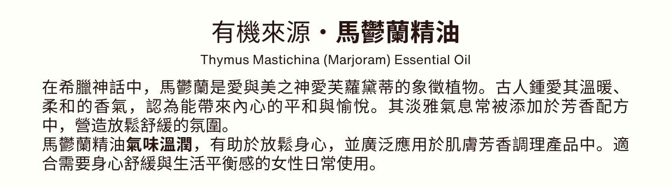 ➤ 馬鬱蘭與高地薰衣草芳香調理,散發淡雅自然香氣