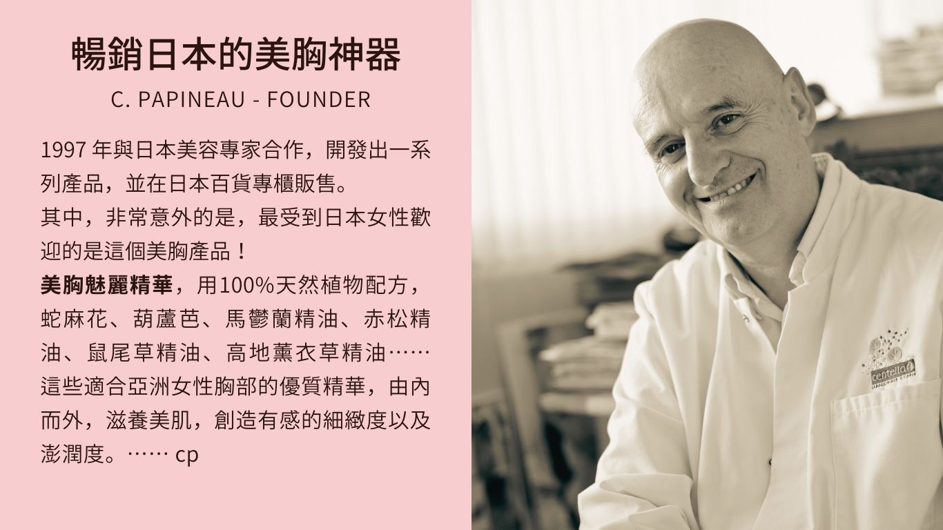 來自法國專業美容 SPA 推薦,Centella 美胸魅麗精華以 100% 天然植物精萃調和,富含馬鬱蘭精油與多種植物油,溫和調理胸部肌膚,提升柔嫩光澤與彈潤觸感,讓肌膚更顯細緻光采。無添加雌激素、防腐劑及人工香色料,提供東方女性每日安心保養選擇。