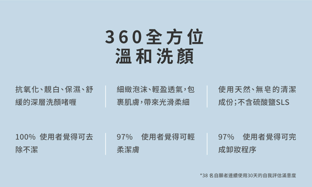 由天然、無皂、萃取自椰子油及蔗糖的清潔成分組成,不含硫酸鹽 SLS / SLES / ALS,可以讓妳每天洗顏而不會損傷皮膚。