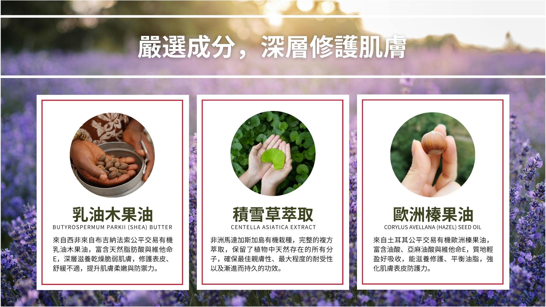 ➤ 多效保濕屏障:富含乳油木果油與蘆薈汁,深層滋養肌膚,同時鎖水保濕