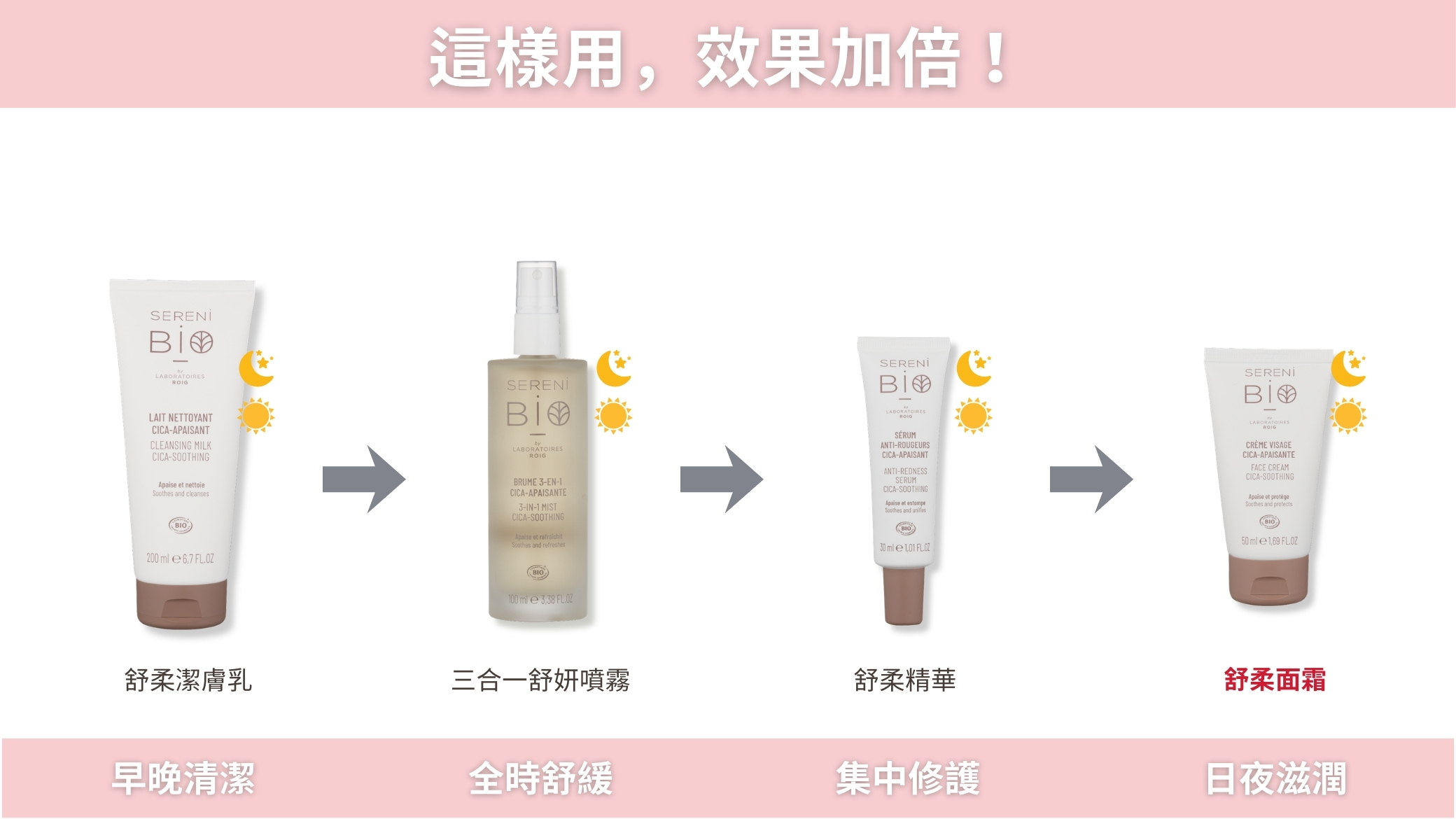 無論是作為日常保養、深層修護晚霜,或作為妝前隔離霜,SERENI BIO 舒柔面霜都能讓肌膚感受無比柔嫩與彈潤。