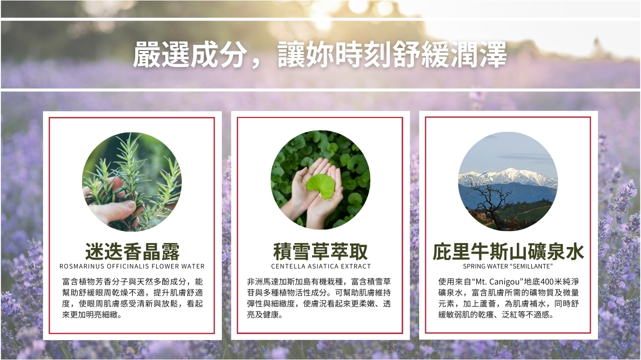 ➤ 含蘆薈汁、積雪草複合萃取,舒緩修護肌膚,長效保濕