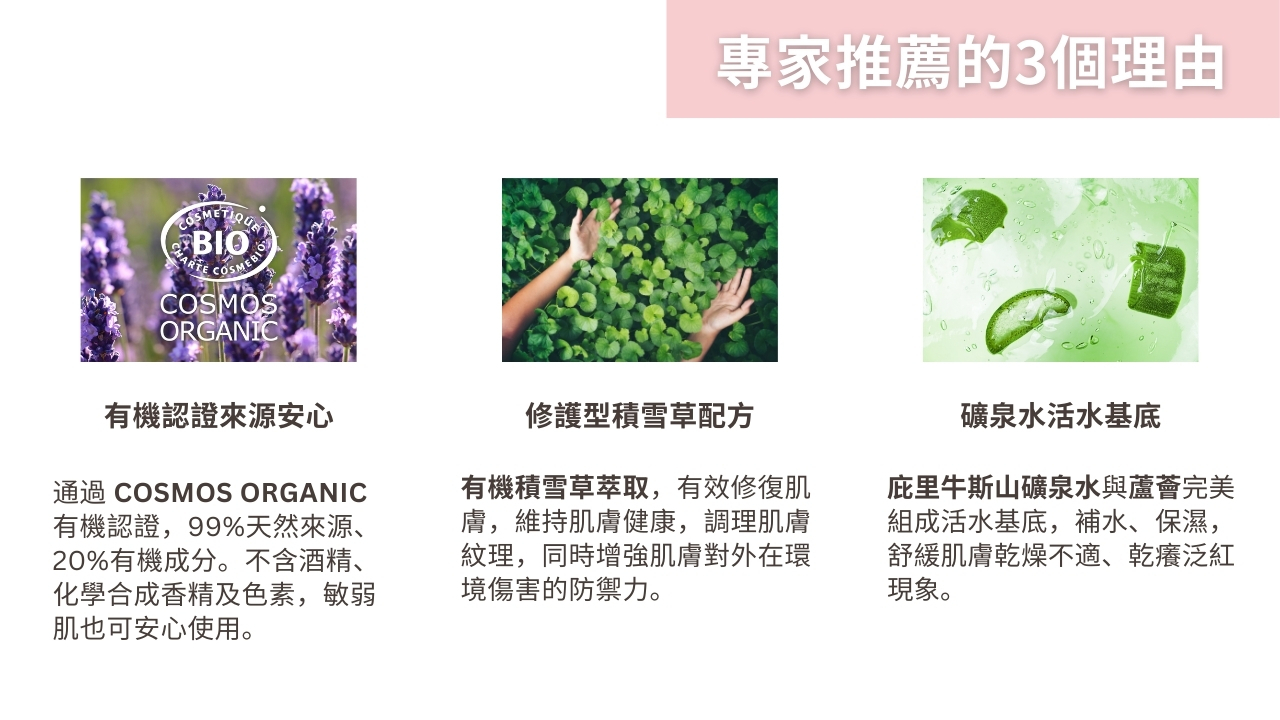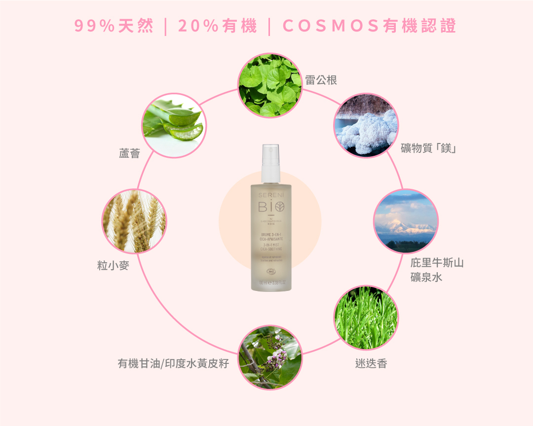 ➤ 法國有機認證:通過 COSMOS ORGANIC 認證,99%天然成分,20%有機成分
