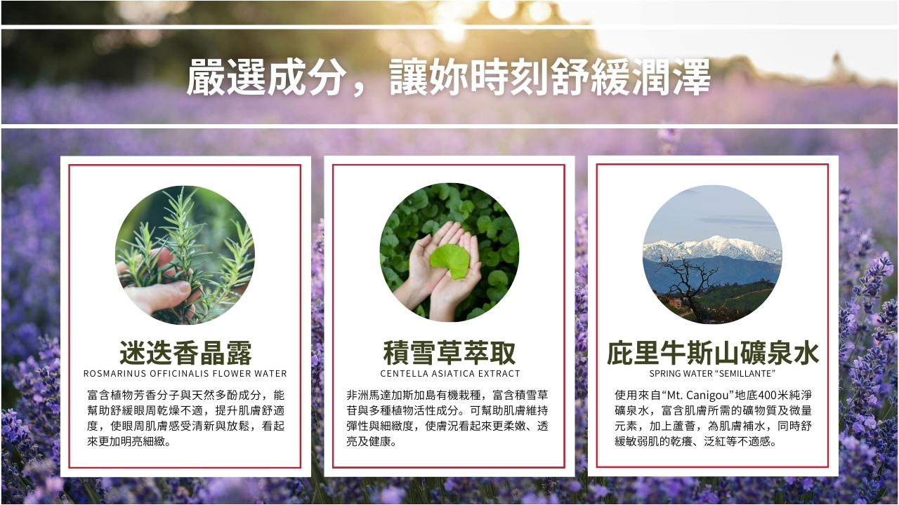 • 迷迭香晶露:具舒緩與調理作用,幫助肌膚恢復活力