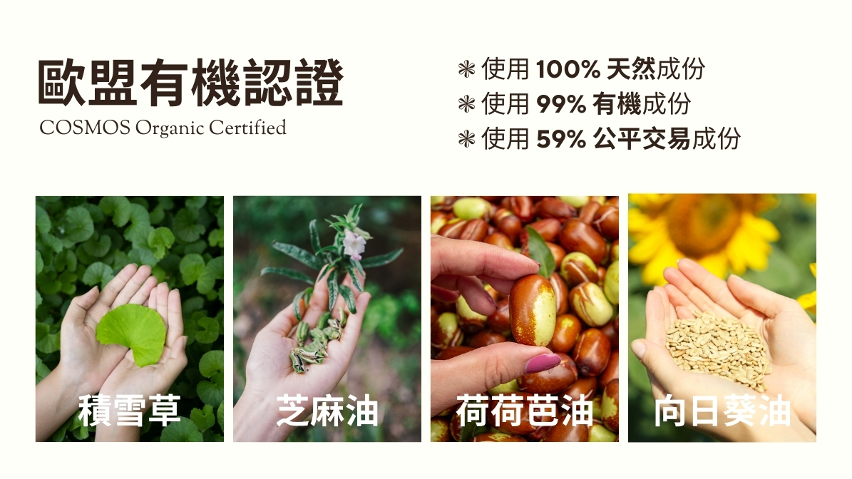➤ 法國 COSMOS 有機認證配方,100% 天然成分、99% 有機成分、59% 公平交易成分,經皮膚科醫師測試,敏弱肌適用