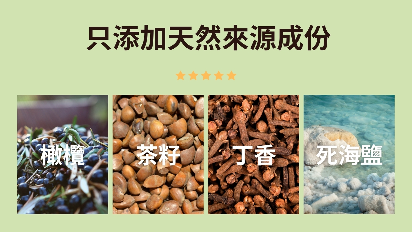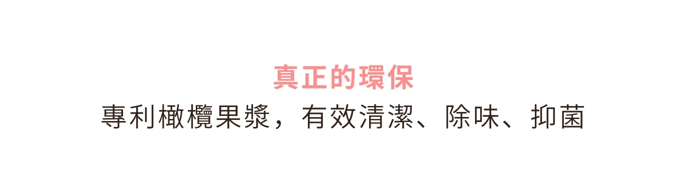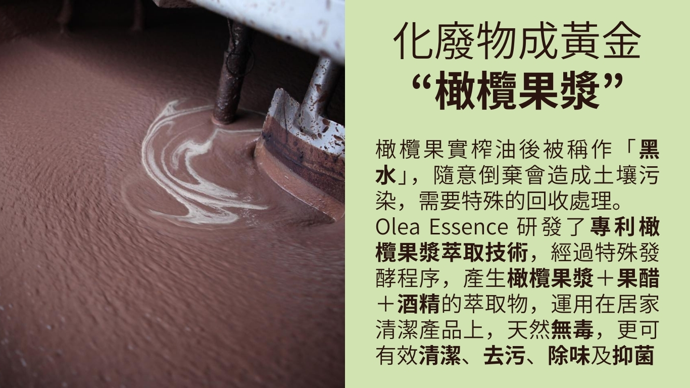 ➤ 專利橄欖果漿,萃取過程產生天然橄欖果醋及天然酒精,有效清潔、除味、抑菌