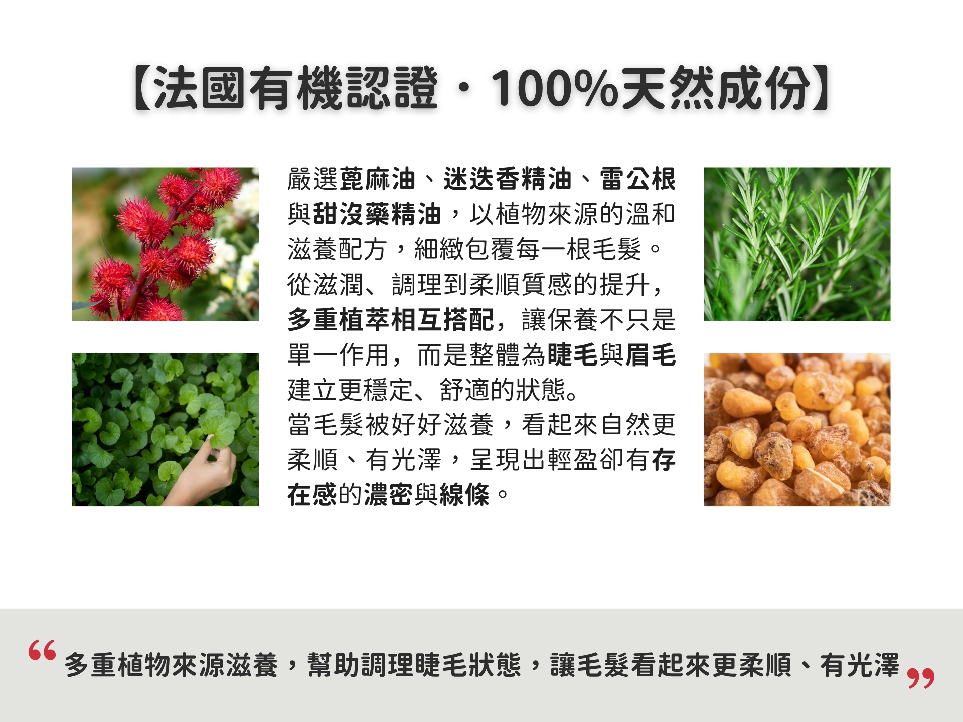 ➤ 有機植萃配方,滋潤與調理睫毛與眉毛