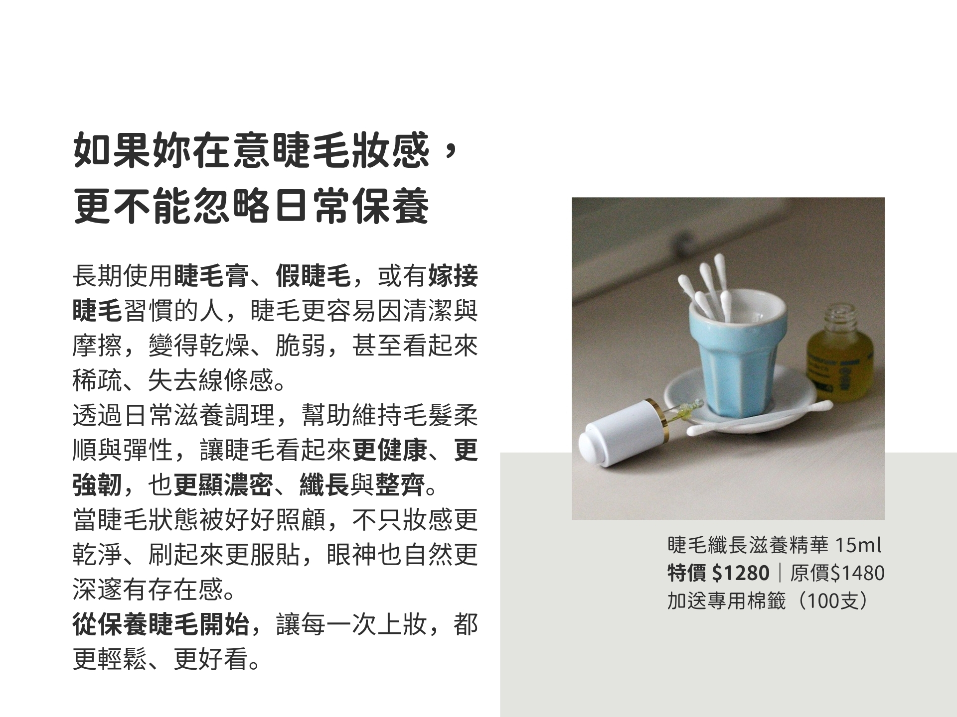 A:建議使用睫毛專用的棉籤,避開嫁接處使用在睫毛根部,或待嫁接完全卸除後再進行完整保養,下次嫁接會更自然、也維持更久。