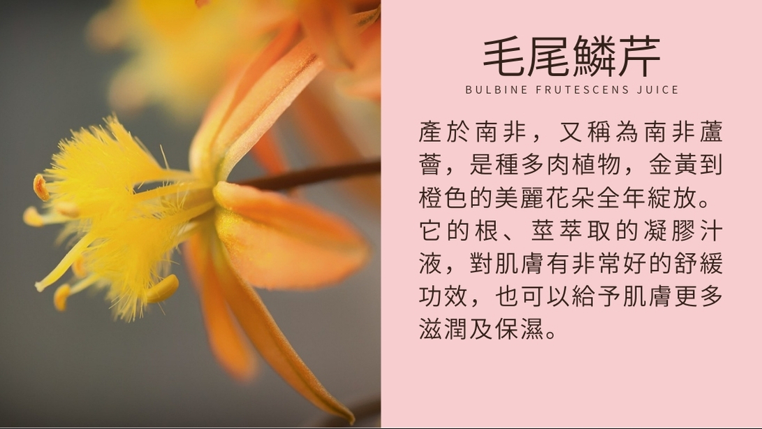 日本苦竹汁、向日葵籽油、甜杏仁油、可可亞脂、雪亞脂、雲母、山茶籽油、玫瑰草精油、天竺葵精油、德國洋甘菊萃取、胡蘿蔔根萃取、大馬士革玫瑰精油、忍冬萃取、維他命E、脂溶性維他命C、甜橙精油、毛尾鱗芹汁、酪梨油、巴夫藻萃取。