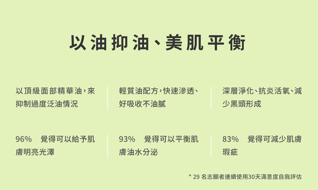 98% 有機植萃配方,輕透好吸收、不油膩膚感,由內而外調控肌膚出油狀況,讓肌膚恢復平衡,同時強健肌膚保護層,重拾肌膚明亮光澤。