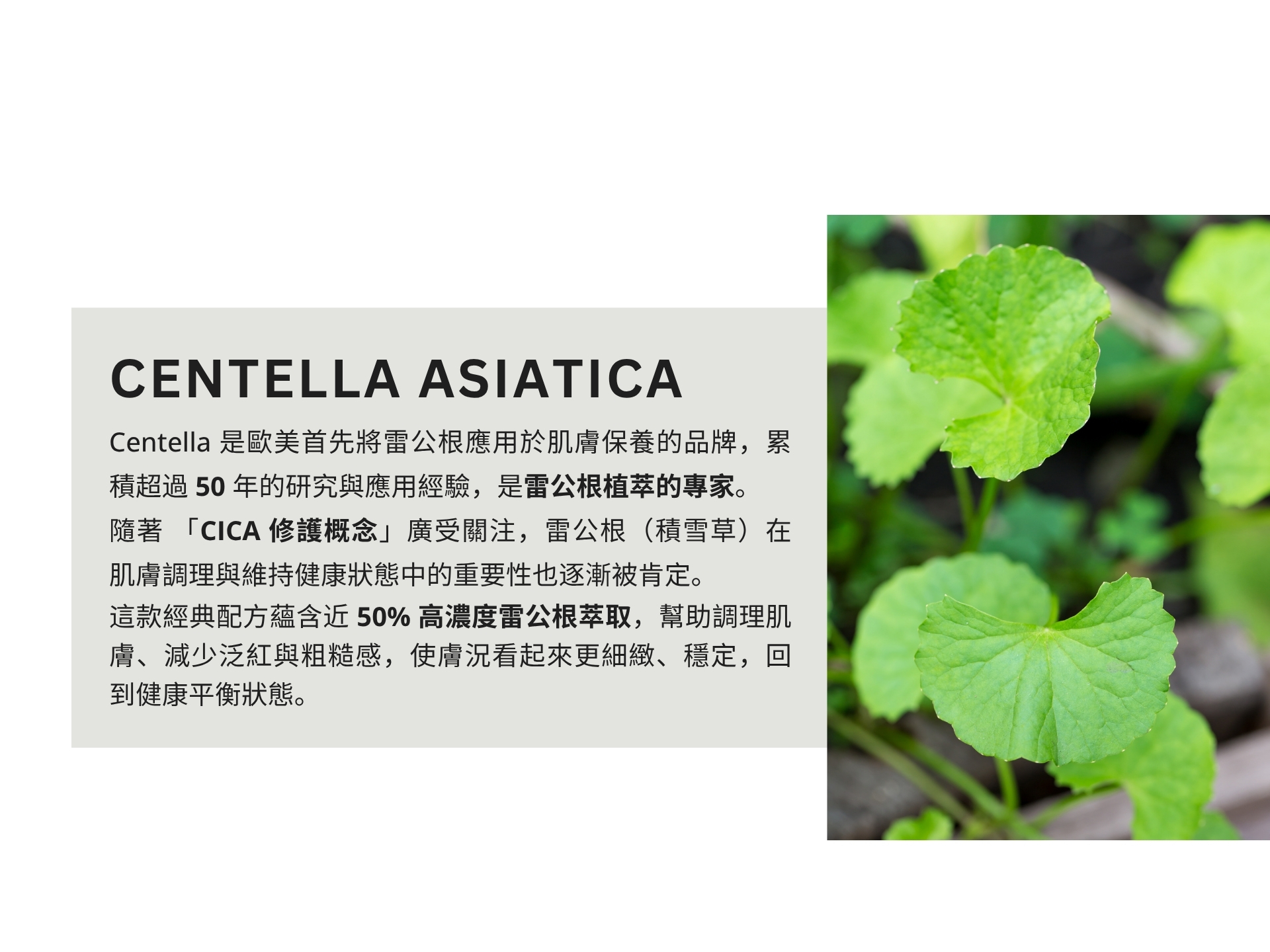 ➤ 近 50% 雷公根高濃度|搭配金縷梅、玻尿酸,調理肌膚更細緻