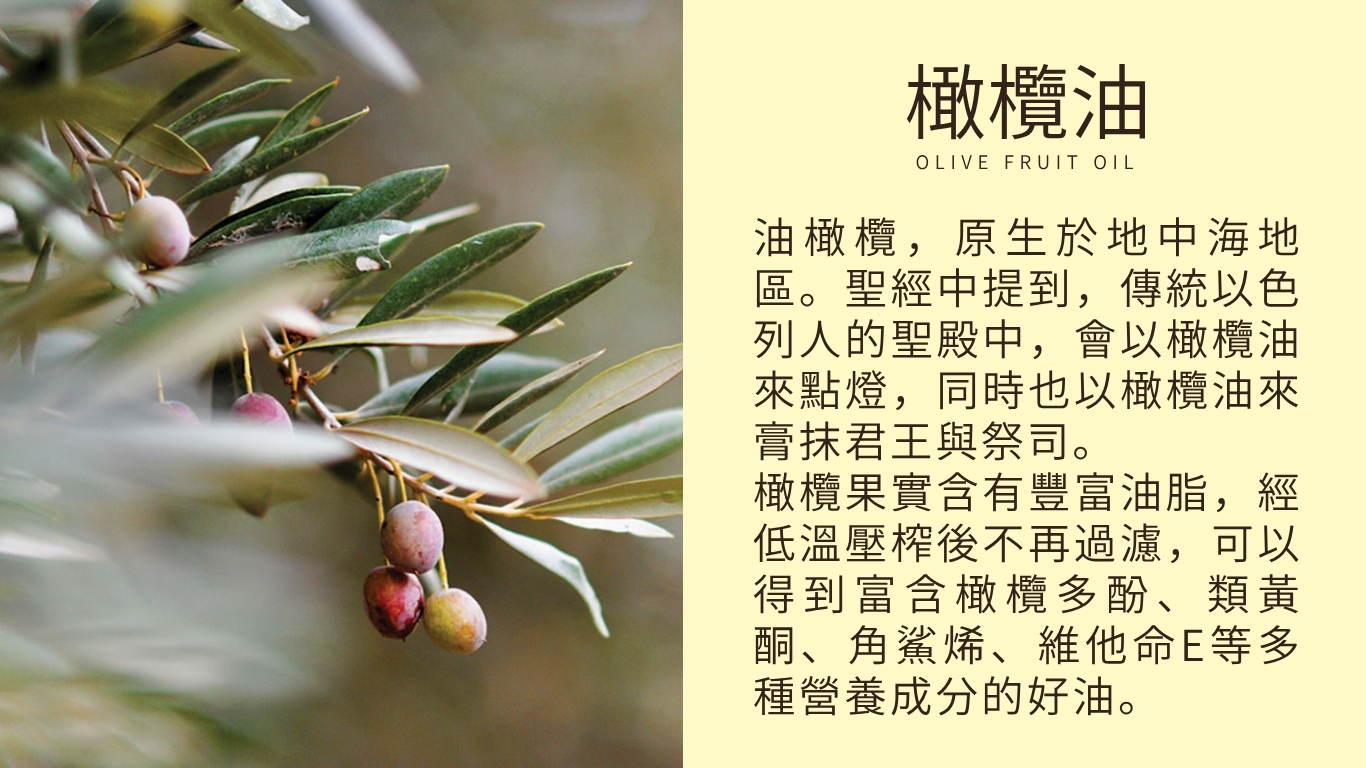 ➤ 冷壓初榨橄欖油:潤膚、保濕、舒緩肌膚同時強化肌膚對抗外在環境的防禦力