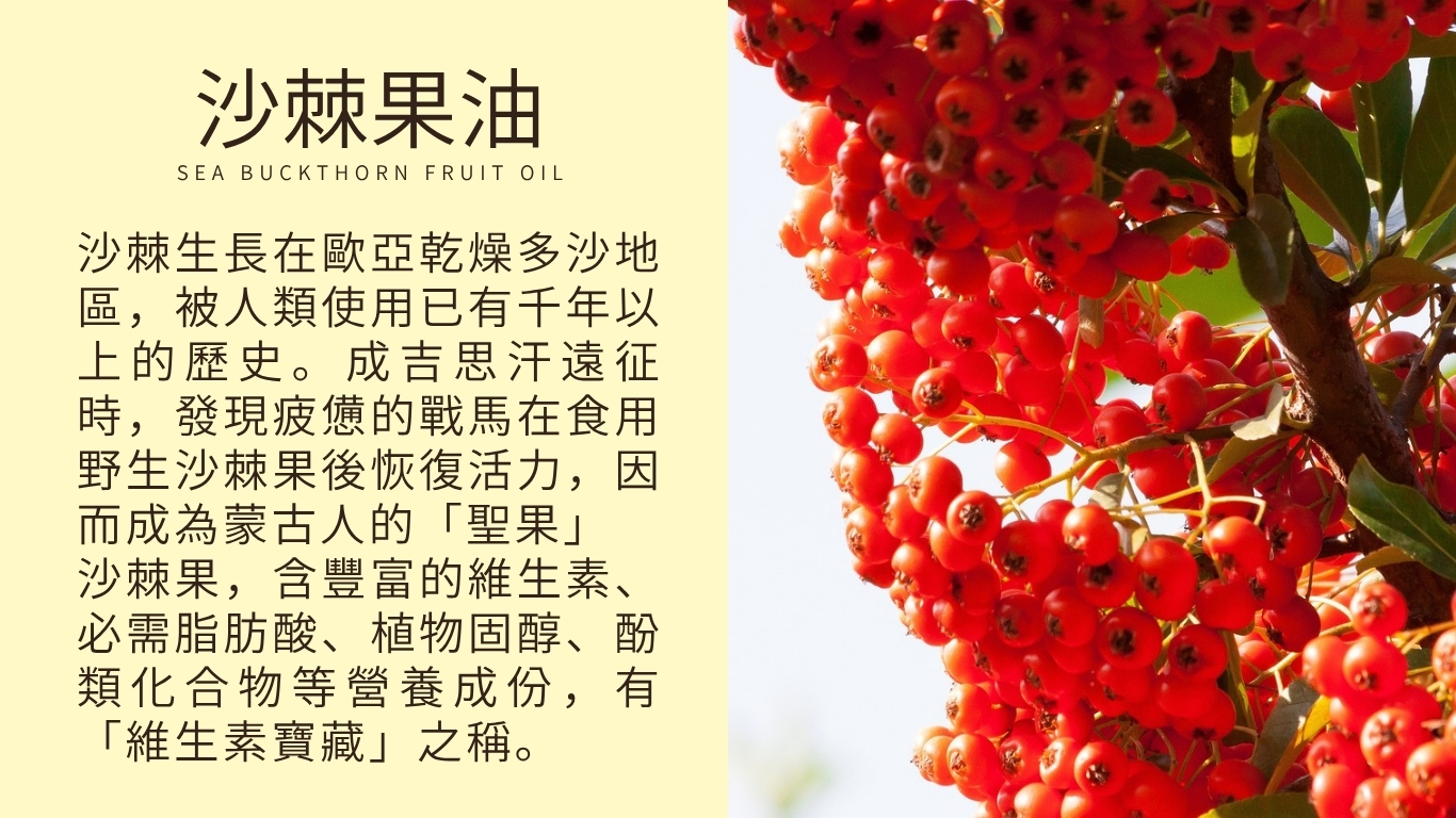 ➤ 沙棘果油:高修護的沙棘果油,調理肌膚、舒緩不適感
