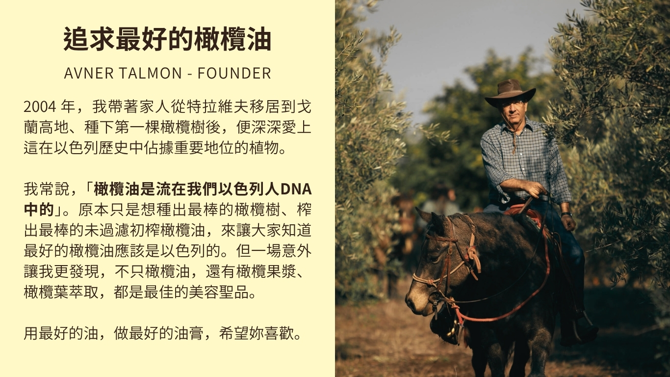 ➤ 全天然橄欖油配方,來自以色列自家農場,未過濾冷壓初榨,完整保留營養