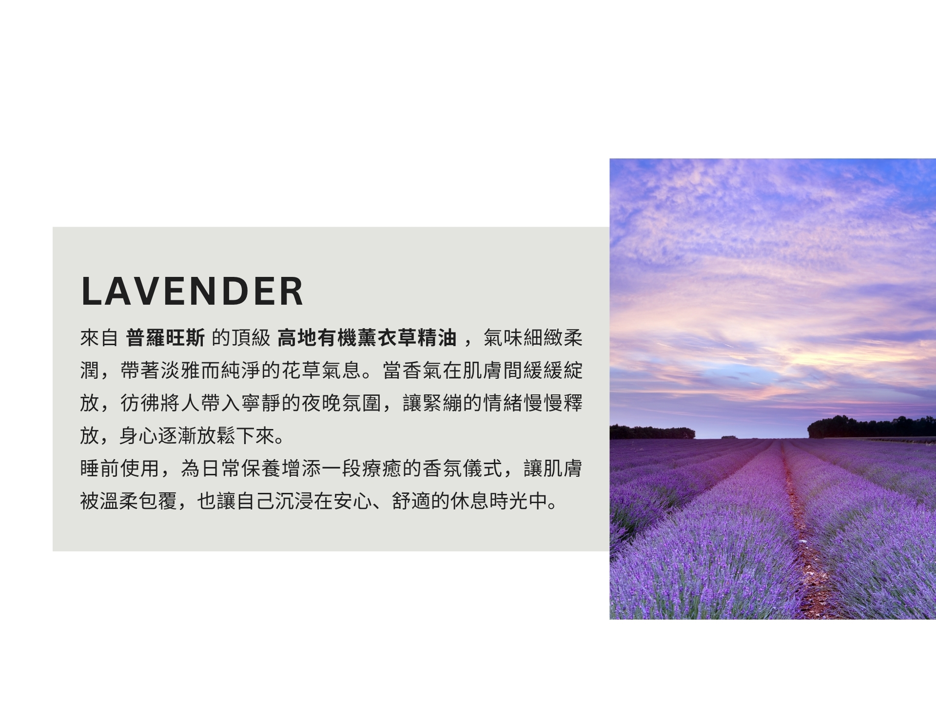 當高地薰衣草與溫暖沒藥氣息緩緩展開,肌膚保養不再只是日常,而是一場屬於夜晚的放鬆儀式。