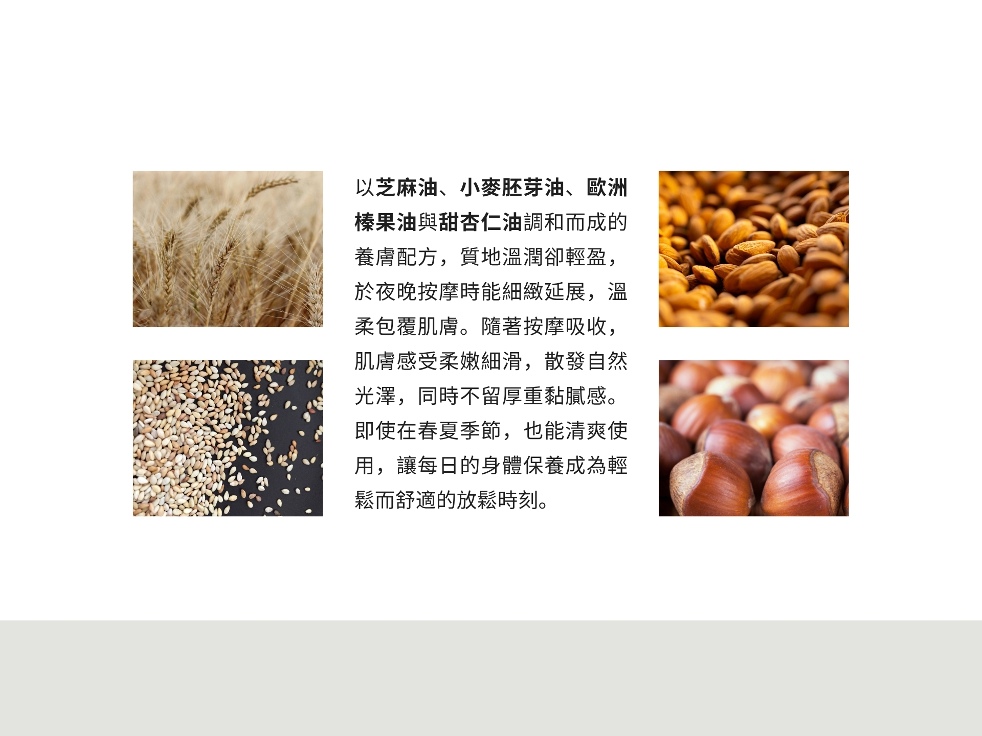 以小麥胚芽油為核心,結合芝麻油、榛果油與甜杏仁油,帶來溫潤而細緻的滋養觸感,輕柔包覆肌膚,調理乾燥與粗糙,讓肌膚回到柔嫩舒適的狀態。
