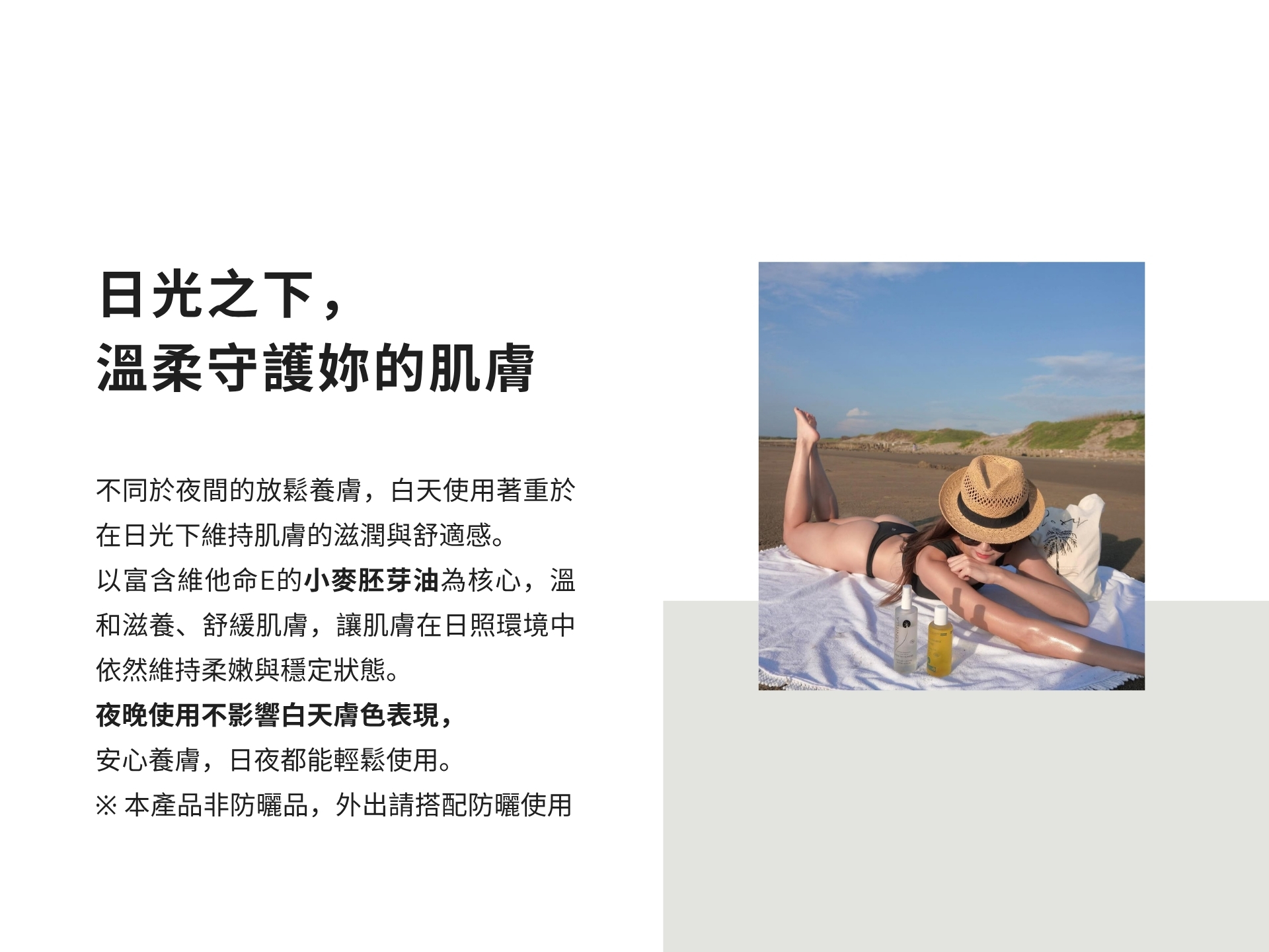 A:夜晚是肌膚放鬆與調理的關鍵時刻。以小麥胚芽油為核心的植物配方,能在睡前溫和滋養肌膚,幫助回復柔嫩觸感,同時讓保養變成一段真正放鬆的儀式。