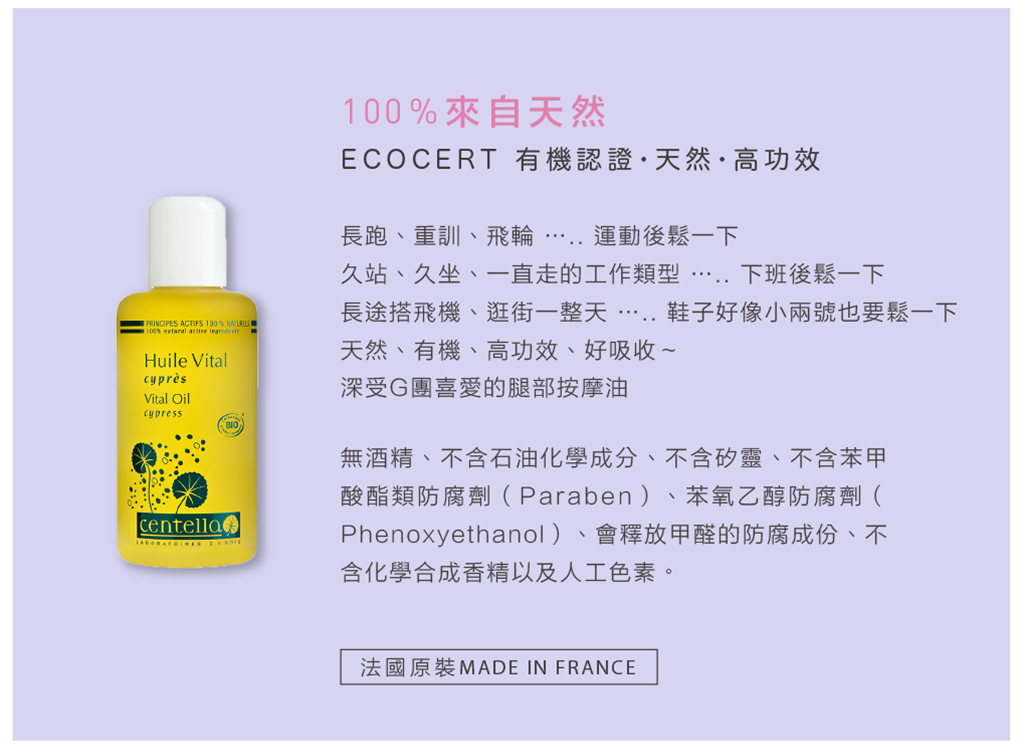 Centella 腿部活力按摩油 是一款專為腿部、腰臀與下背肌膚打造的天然按摩油,結合品牌超過 50 年對雷公根的專研精神,搭配多種芳香植物精油,打造高效放鬆又溫和的腿部保養體驗。