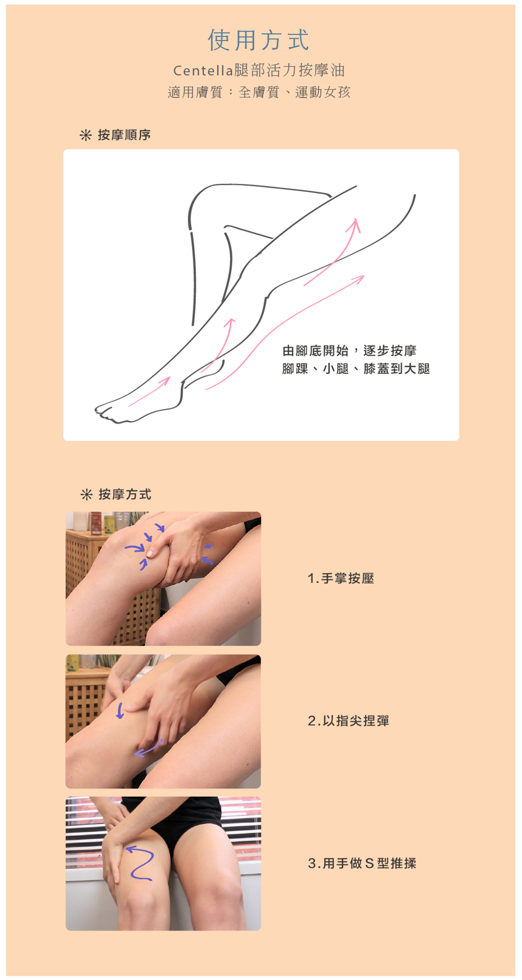 ➤ 建議於沐浴後,取適量精華,從左腳開始由足部向上按摩至大腿,可加強按摩膝蓋及膝蓋內側肌膚,再換右腳進行同樣動作。搭配繞圈按摩方式,讓雙腿肌膚恢復活力與彈性。